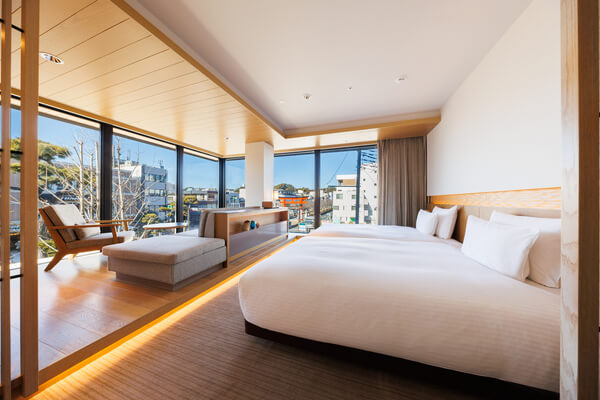 ロビーや中庭には大谷石などを配し、縁側のエッセンスを取り入れたデザイン。街の喧騒を忘れさせる静寂な空間で、鎌倉らしい和の趣と現代的な心地よさが融合した滞在を提供します。