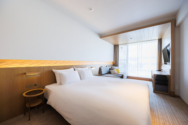 180cm幅のキングサイズベッドを設置。過ごしやすい空間と機能性を両立させたダブルルームです。