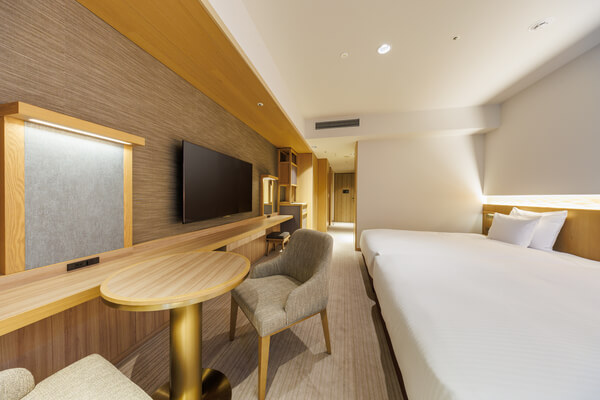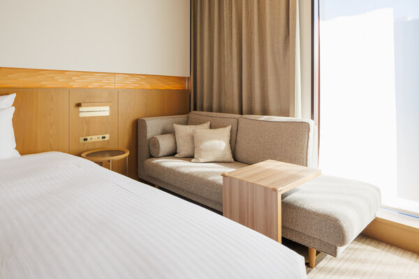 大きなソファと140cm幅のダブルサイズベッドを2台配置。くつろぎのスペースとして、ティーテーブルセットをご用意しました。ゆとりある広さで、シンプルなレイアウトながらも機能的にお使い頂けるお部屋です。
