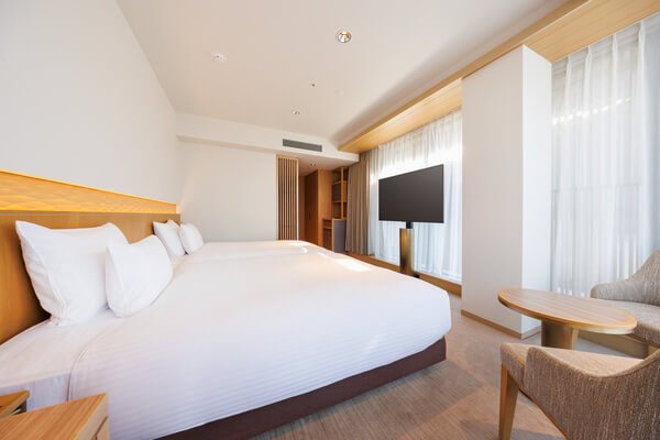 大きな窓から陽光の射し込む明るいスペースに、140cm幅のダブルサイズベッドを2台配置。ゆったりとお過ごしいただける角部屋です。身支度に便利な三面鏡付きのデスクをご用意します。
