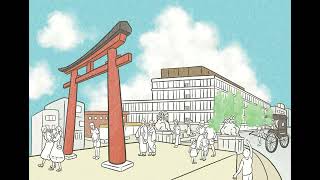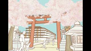 実際の景色を再構成し、桜・鳥居・ホテルの三要素が心地よく響き合うよう構成しています。