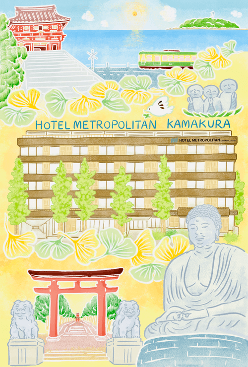 スタンダードのイラストは、ホテルを主役に、鎌倉の定番スポットをぎゅっと収めた一枚となっています。