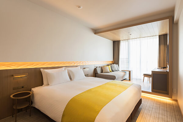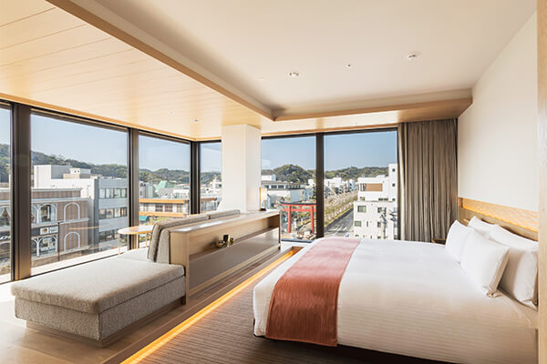 足元まである大きな窓からは鶴岡八幡宮二の鳥居を眺められ、鎌倉らしい景色をご覧いただける角部屋です。広々とした180cm幅のキングサイズベッド、ゆとりある間取り、バスエリアにはお2人同時にご利用いただけるダブルベーシンと、洗い場にはレインシャワーをご用意します。