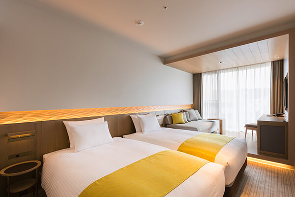 120cm幅のシングルサイズベッドを2台設置し、ご自宅のようにおくつろぎいただける、縁側をイメージした小上がりをご用意しました。