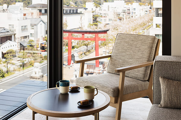 木のぬくもりを感じるロビー、心地よい風を感じる縁側のようなテラス、四季折々の植栽豊かな中庭、鶴岡八幡宮の二の鳥居が眺められる部屋など、お客さまだけの特別な別邸としてご利用ください。